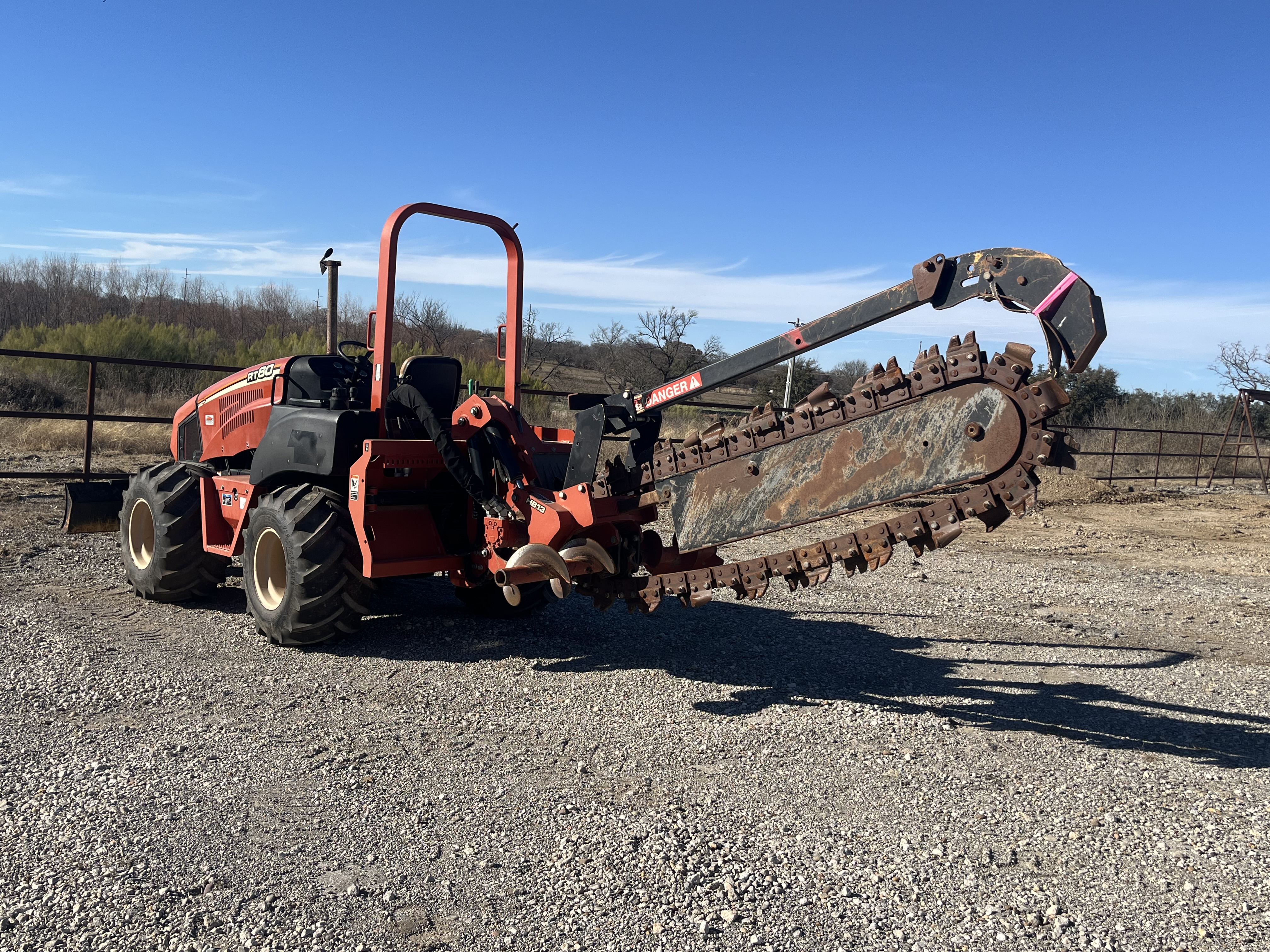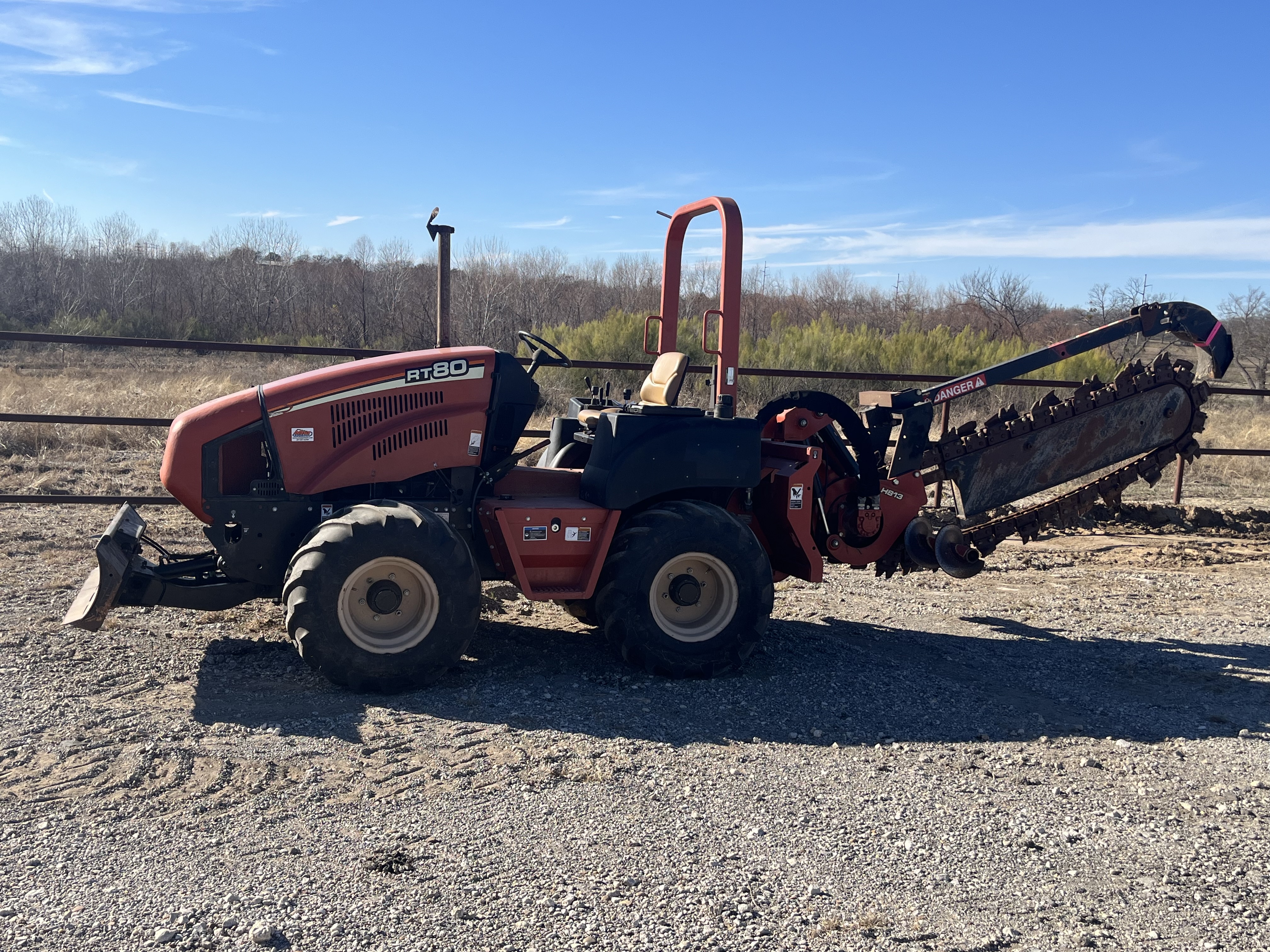 2009 Ditch Witch Rt80 with H813 trench head. This is a really solid machine that features rear crab steer, cruise control, 6 way dozer blade,59in trenching depth, side shift trenching. Only 292 hour and ready to go to work. Located in Weatherford Texas with shipping and financing available. Ditch Witch RT80 Rubbered Tire Trencher 2009